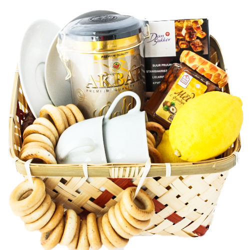 Состав: лукошко без ручки, 2 чашки с блюдцем. чай, сахар. мед. 2 лимона, декор сушки