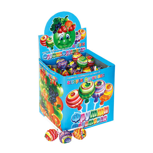 Карамель на палочке "Фрутти" можно купить оптом с доставкой по Москве, Подмосковью и ЦФО. Низкая цена обусловлена отсутствием посредников при наличии прямого договора с производителем. Все актуальные сертификаты в наличии. Минимальный заказ: 1 коробка
